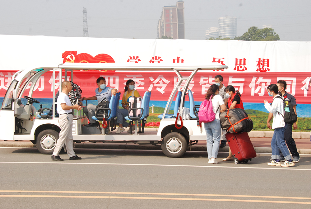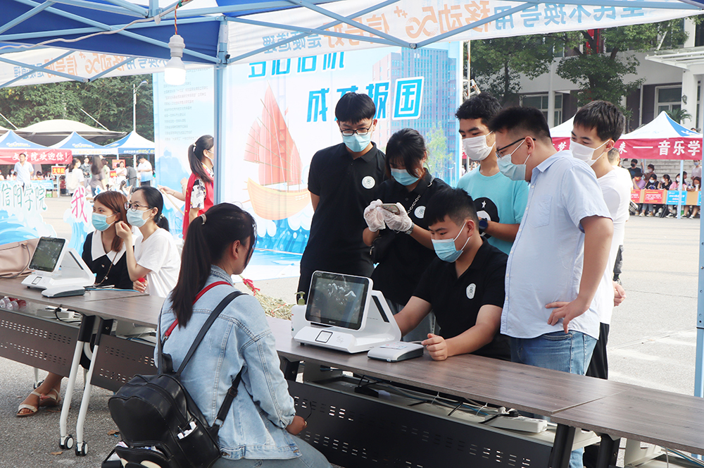 为确保新生入学工作的顺利开展,学校在信阳火车站、信阳东站、信运汽车站、弘运汽车站均安排了迎新车辆。学生入校前需在平安入校系统中上传健康码、行程码和48小时内核酸检测阴性报告。校门口设立测温区、核验区、留观区,在完成体温测量、健康信息核验后,对其所带行李进行消杀,并发放校园通行证,确保新生安全入校。